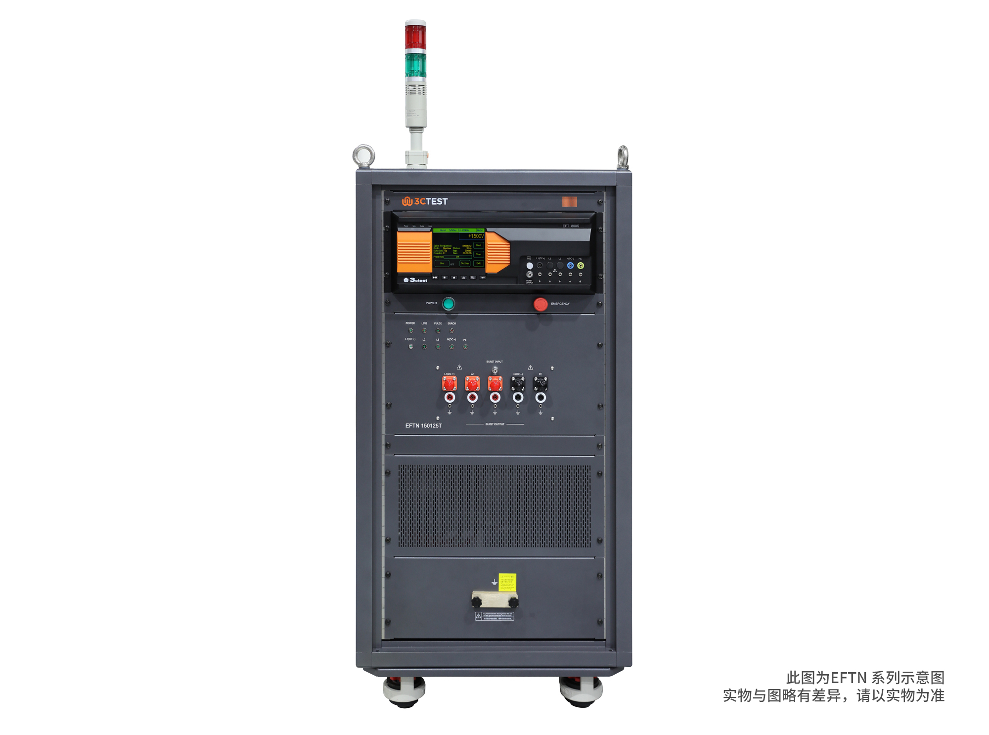 EFTN系列高压大功率脉冲群耦合/去耦网络符合IEC 61000-4-4标准,实现全自动三相耦合/去耦功能,可满足AC/DC交直流供电,配套CCS、EFT系列仪器使用,EUT最大带载能力AC 1500 V 125 A、DC 3000 V 125 A 三相五线,其他EUT电压、电流等级,可以根据客户要求定制。